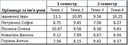 На основі заданого шаблону створити таблицю за зразком (у прикріпленні). Заготовку для роботи можна завантажити за посиланням https://jsfiddle.net/vleonteva/1qbgau7v/ – можна працювати у власній копії завдання, яку згодом зберегти, а посилання викласти до даної секції.