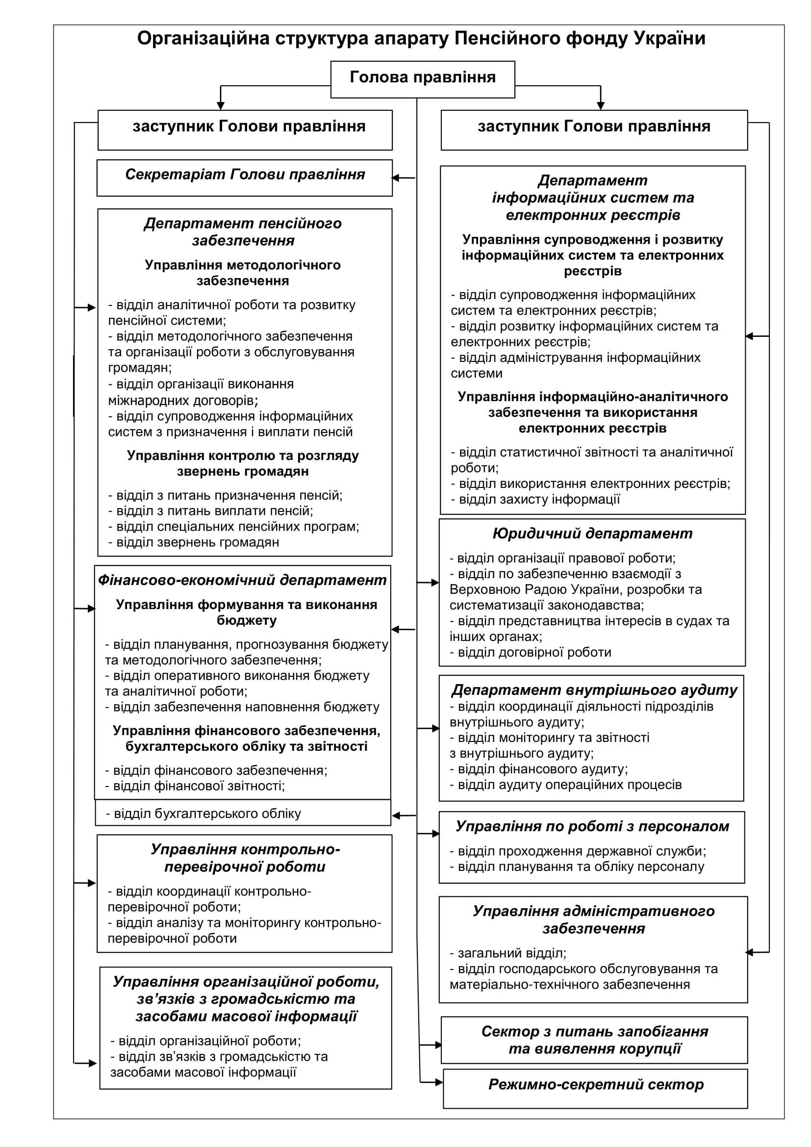 Третій сайт державної установи з структурою якої я ознайомилась був сайт Пенсійного фонду України а саме Структура Центрального апарату Пенсійного фонду України. Я звернула увагу що тут, навідміну від інших установ , візуалізували структуру у вигляді таблиці , тому набагато понятніше як вони працюють. (додала скриншот структури)