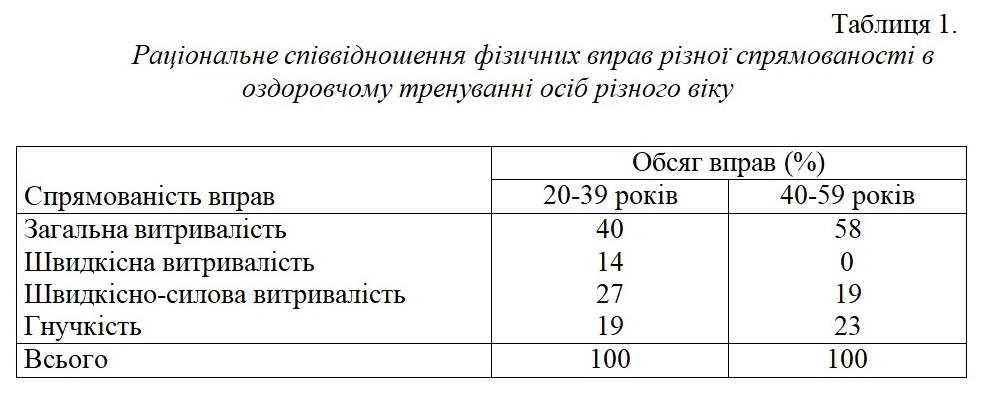 Для збереження і зміцнення здоров’я рекомендуються циклічні вправи (біг, плавання, їзда на велосипеді, ходьба на лижах, веслування), оздоровчі види гімнастики, спортивні ігри. Оптимізація режимів фізичних навантажень досягається шляхом систематичної зміни видів фізичних вправ і досягнення тренувального ефекту при обмежених за обсягом та інтенсивністю фізичних навантаженнях. У цьому віковому періоді рекомендується сезонна зміна видів фізичних вправ мінімум - два, максимум - чотири рази на рік.