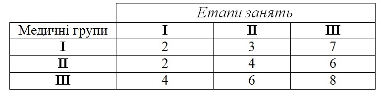 Заняття у фізкультурно-оздоровчих групах планують у 3 етапи. Тривалість етапів обумовлена належністю осіб, що займаються до певної медичної групи.