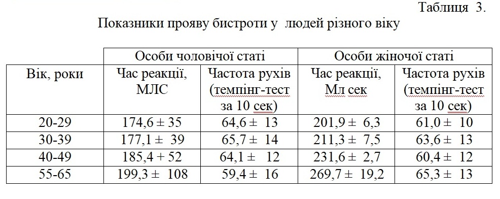 Вікові морфо-функціональні зміни призводять до зниження працездатності і окремих фізичних якостей. Падають показники швидкості і точності рухів, менш досконалою стає координація рухів, поступово зменшується їх амплітуда. Так, у осіб похилого віку значно зменшуються показники психомоторної реакції і частоти рухів (табл. 3), погіршуються силові показники (табл. 4).