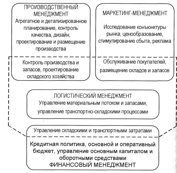 Дуже важливим для досягнення значних кінцевих результатів діяльності фірми є успішна взаємодія логістичного менеджменту з іншими видами функціонального менеджменту. У самому загальному виді характер разом взаємодії представлений на рис. 2.1, де приведені управлінські функції, реалізовані як у рамках тільки одного з функціональних видів менеджменту (логістичного, виробничого, маркетингового, фінансового), так і в результаті їхньої взаємодії.